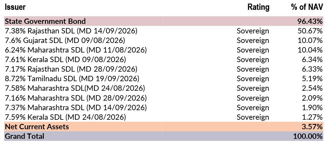 ![]() | RESIDUAL MATURITY* | 0.82 years | MODIFIED DURATION* | 0.78 years | MACAULAY DURATION* | 0.8 years | Annualised Portfolio YTM * | 5.84% |