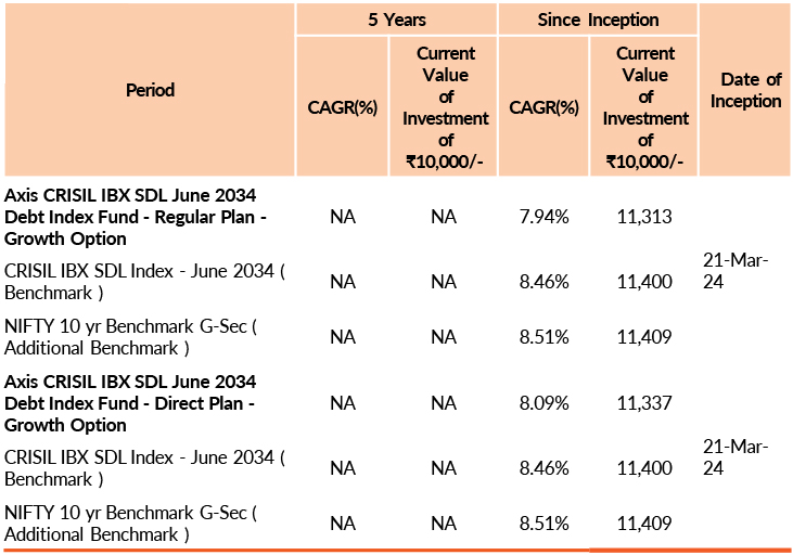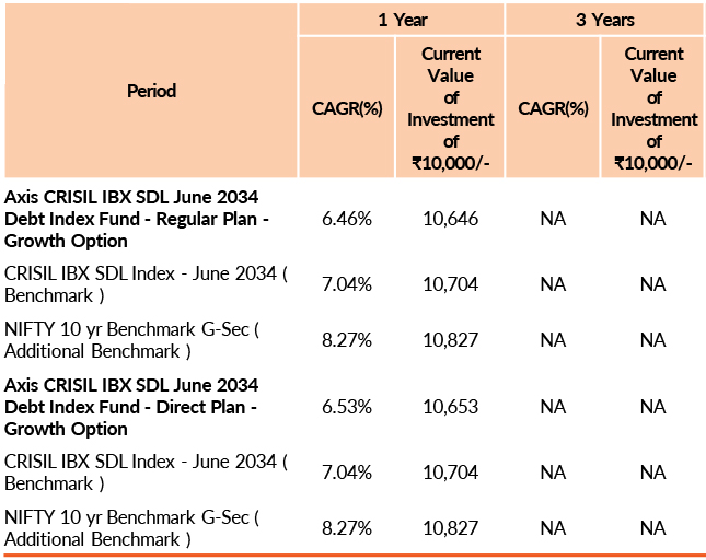 | Axis CRISIL IBX SDL June 2034 Debt Index Fund | 31-Oct-2025 | -0.58 | - | - | - | -0.52 |