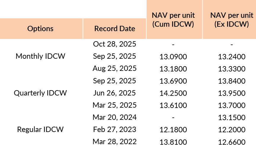 Pursuant to payment of Distribution (of Income & Capital), the NAV of the above stated IDCW options of the scheme/plan would fall to the extent of payout and statutory levy, if any. Past performance may or may not be sustained in future. Face value of units is ₹ 10. IDCW means Income Distribution cum Capital Withdrawal.
