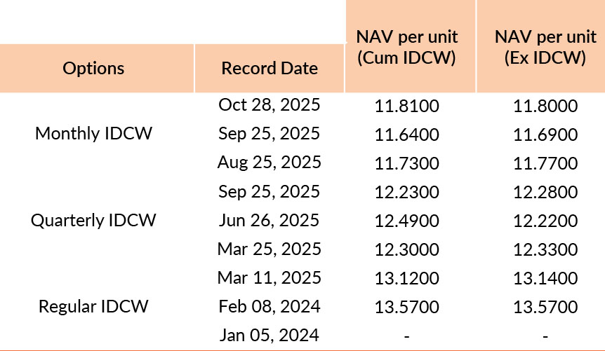 Pursuant to payment of Distribution (of Income & Capital), the NAV of the above stated IDCW options of the scheme/plan would fall to the extent of payout and statutory levy, if any. Past performance may or may not be sustained in future. Face value of units is ₹ 10. IDCW means Income Distribution cum Capital Withdrawal.