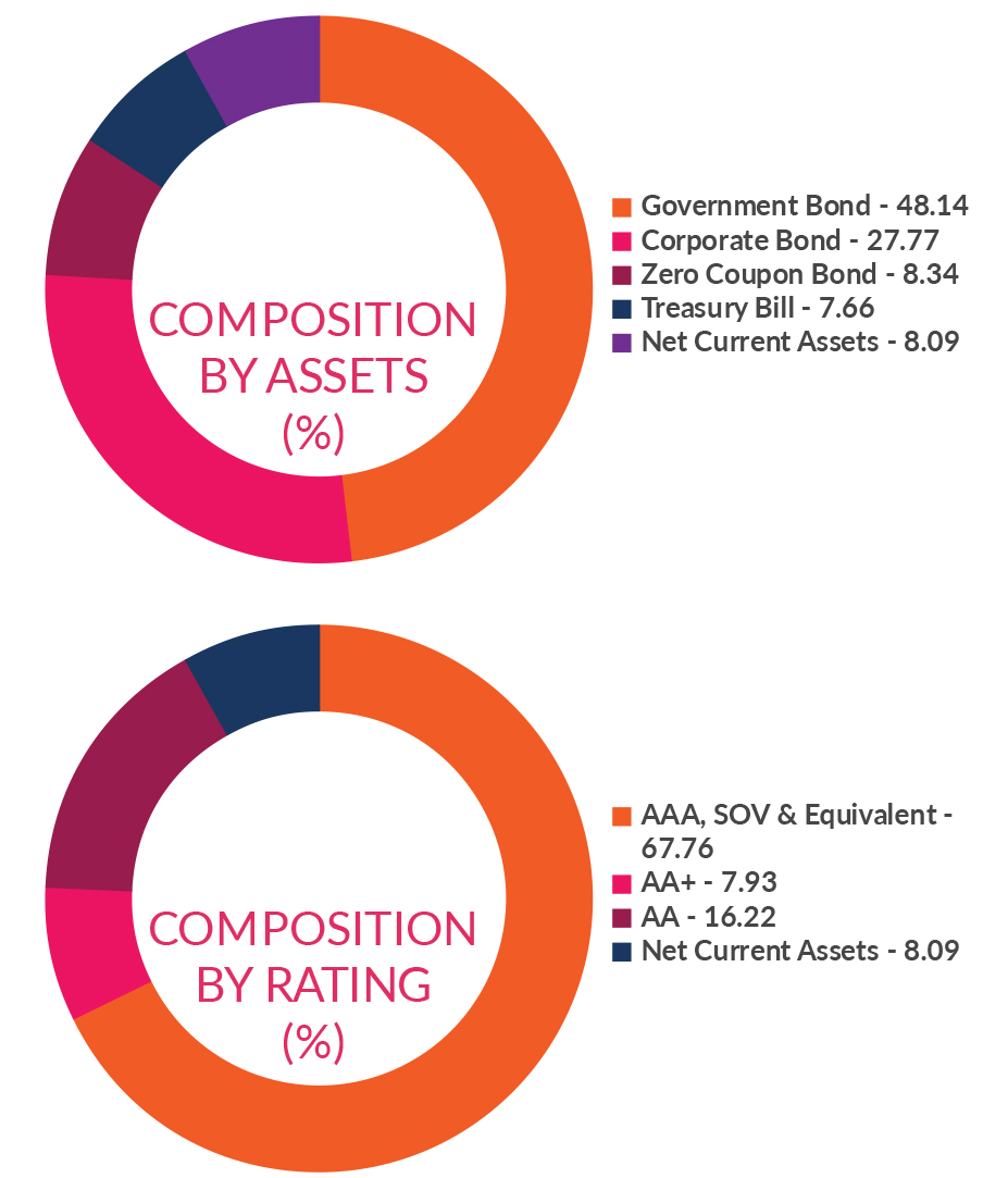 ![]() | Residual Maturity* | 11.39 years | Modified Duration* | 5.14 years | Macaulay Duration* | 5.35 years | Annualised Portfolio YTM* | 7.22% | *in case of semi annual YTM, it will be annualised |