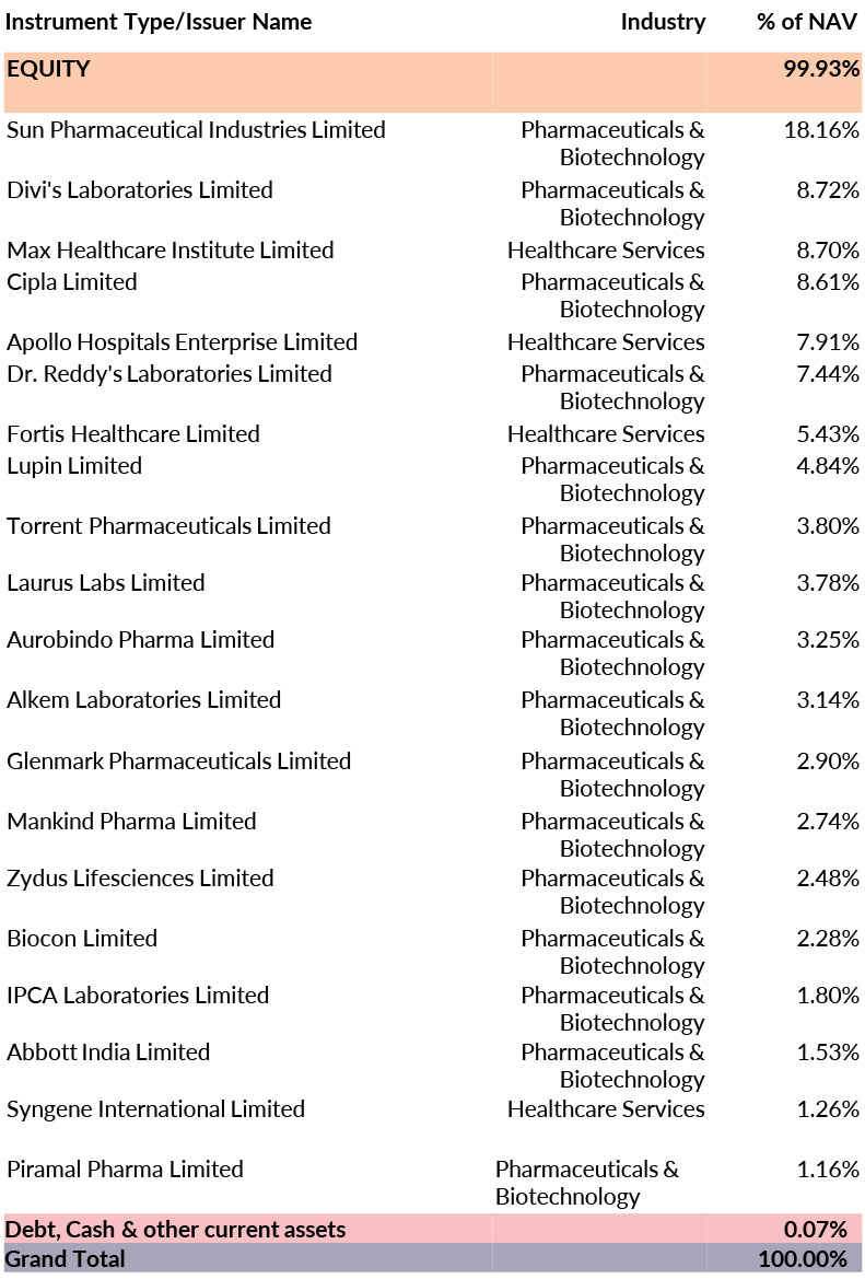 The investment objective of the Scheme is to provide returns before expenses that closely correspond to the total returns of the NIFTY Healthcare Index subject to tracking errors. There is no assurance that the investment objective of the Scheme will be achieved.