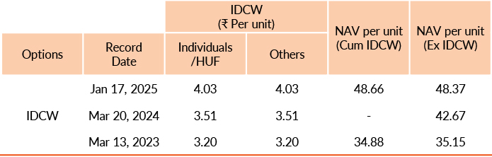 Pursuant to payment of Distribution (of Income & Capital), the NAV of the above stated IDCW options of the scheme/plan would fall to the extent of payout and statutory levy, if any. Past performance may or may not be sustained in future. Face value of units is ₹ 10. IDCW means Income Distribution cum Capital Withdrawal.