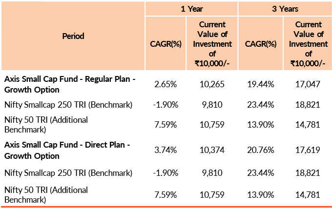 Past performance may or may not be sustained in future.Different plans have different expense structure. Tejas Sheth is managing the scheme since 13th May 2024 and he manages 1 schemes of Axis Mutual Fund & Mayank Hyanki is managing the scheme since 3rd August 2023 and he manages 3 schemes of Axis Mutual Fund & Krishnaa N is managing the scheme since 1st March 2024 and she manages 24 schemes of Axis Mutual Fund . Please refer to annexure for performance of all schemes managed by the fund manager. Returns greater than 1 year period are compounded annualised (CAGR). Face Value per unit : ₹ 10.