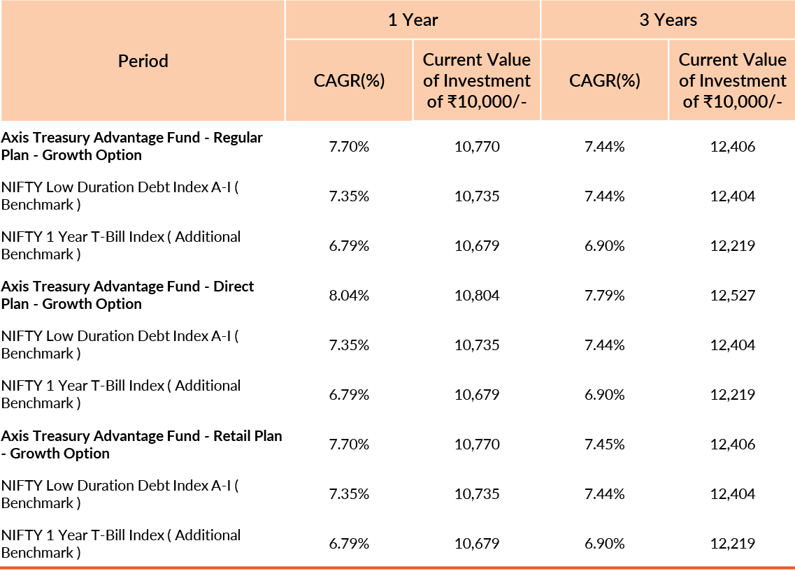 Past performance may or may not be sustained in future. Different plans have different expense structure. Devang Shah is managing the scheme since 7th June 2016 and he manages 21 schemes of Axis Mutual Fund & Aditya Pagaria is managing the scheme since 13th August 2016 and he manages 22 schemes of Axis Mutual Fund . Please refer to annexure for performance of all schemes managed by the fund manager. Returns greater than 1 year period are compounded annualised (CAGR). Face Value per unit : ₹ 1,000.