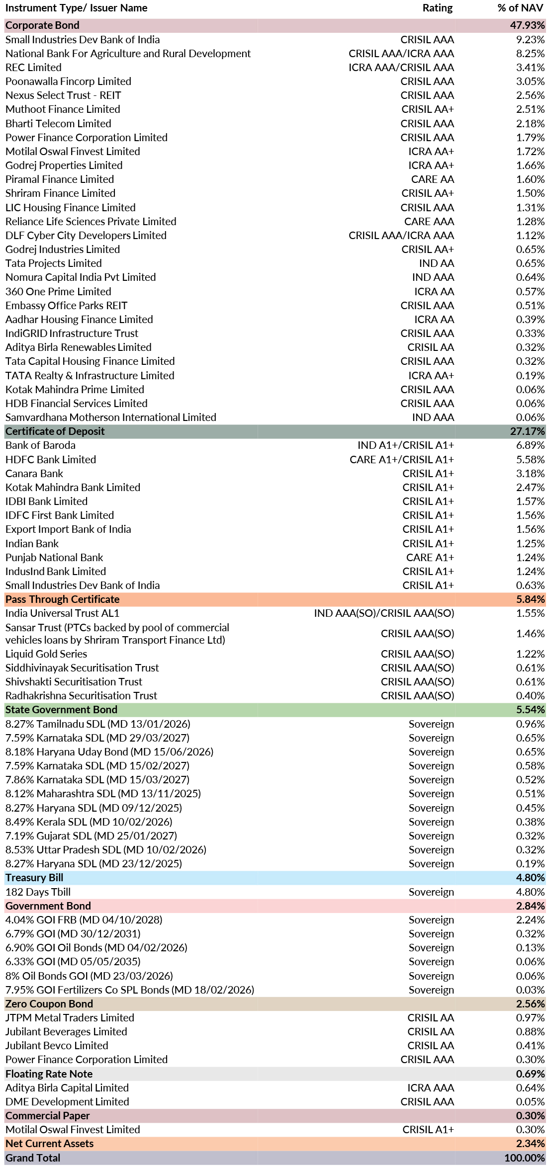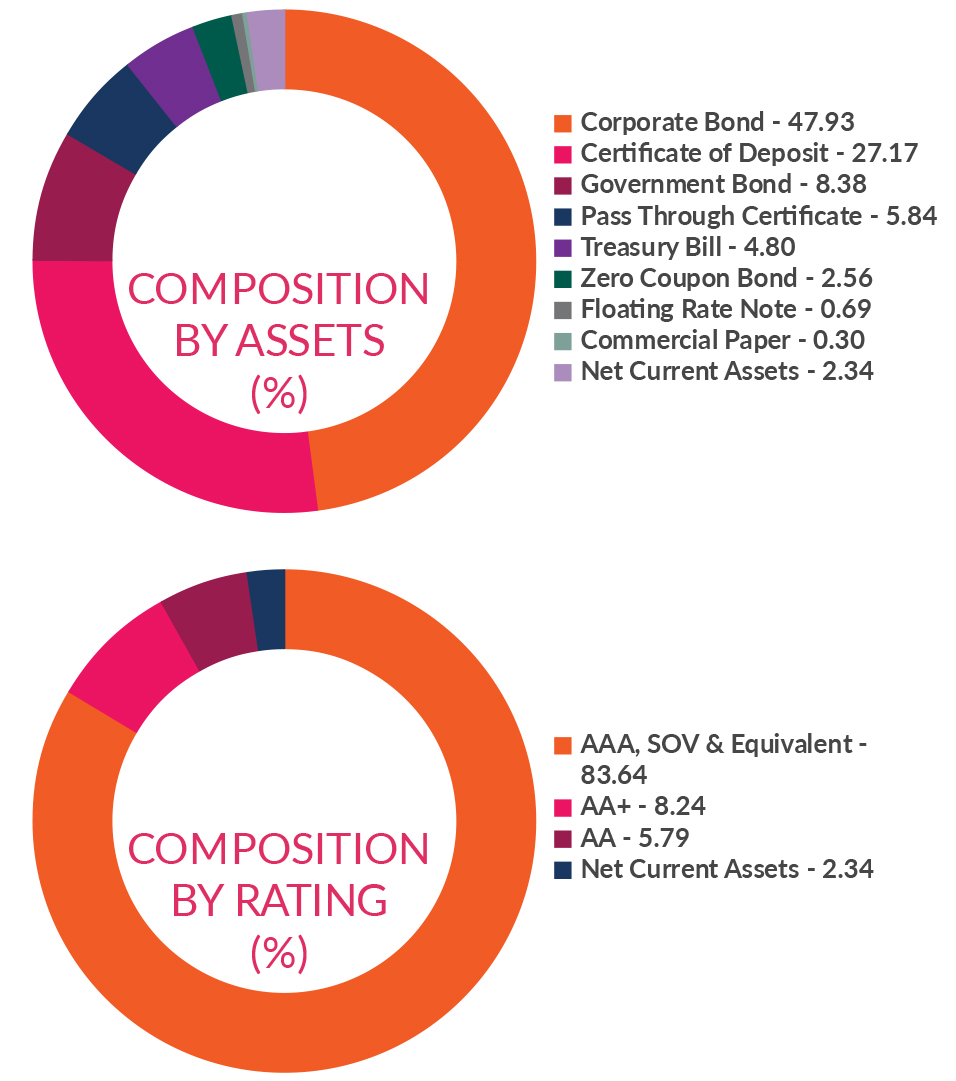 ![]() | Residual Maturity* | 383 Days | Modified Duration* | 325 Days | Macaulay Duration* | 344 days | Annualised Portfolio YTM* | 6.68% | *in case of semi annual YTM, it will be annualised |