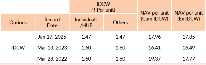 Pursuant to payment of Distribution (of Income & Capital), the NAV of the above stated IDCW options of the scheme/plan would fall to the extent of payout and statutory levy, if any. Past performance may or may not be sustained in future. Face value of units is ₹ 10. IDCW means Income Distribution cum Capital Withdrawal.