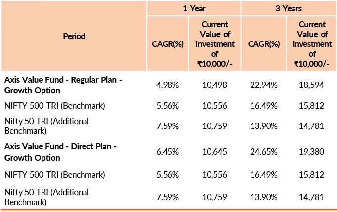 Past performance may or may not be sustained in future.Different plans have different expense structure. Nitin Arora is managing the scheme since 26th May 2023 and he manages 4 schemes of Axis Mutual Fund & Krishnaa N is managing the scheme since 1st March 2024 and she manages 24 schemes of Axis Mutual Fund . Please refer to annexure for performance of all schemes managed by the fund manager. Returns greater than 1 year period are compounded annualised (CAGR). Face Value per unit : ₹ 10.