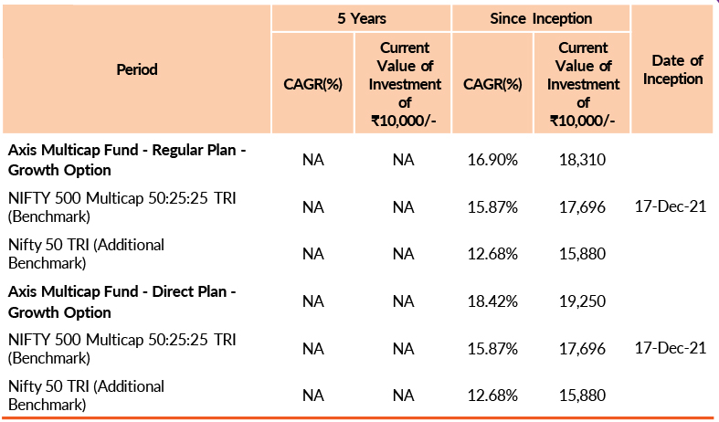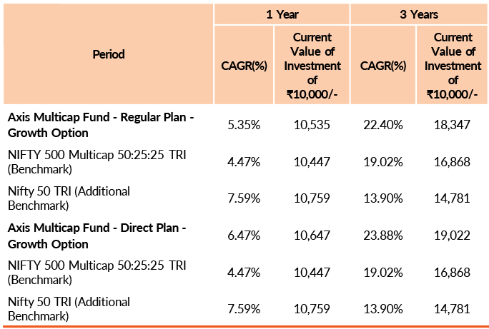 Past performance may or may not be sustained in future.Different plans have different expense structure. Nitin Arora is managing the scheme since 26th May 2023 and he manages 4 schemes of Axis Mutual Fund & Shreyash Devalkar is managing the scheme since 1st March 2023 and he manages 8 schemes of Axis Mutual Fund & Hitesh Das is managing the scheme since 26th May 2023 and he manages 4 schemes of Axis Mutual Fund . Please refer to annexure for performance of all schemes managed by the fund manager. Returns greater than 1 year period are compounded annualised (CAGR). Face Value per unit : ₹ 10.