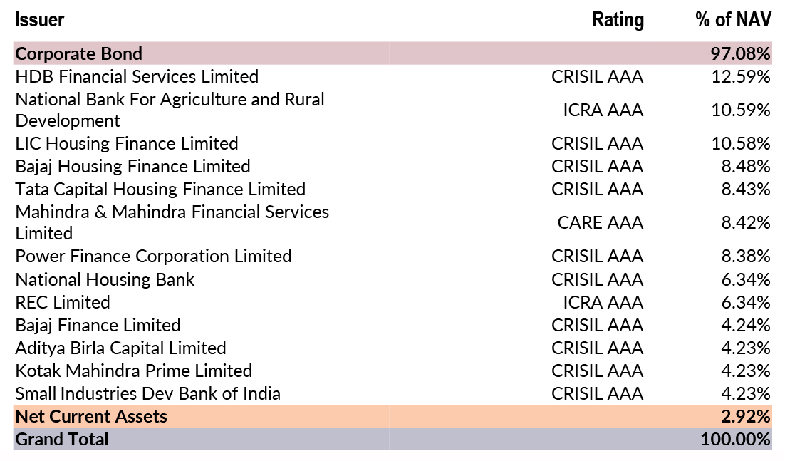 ![]() | RESIDUAL MATURITY* | 1.82 years | MODIFIED DURATION* | 1.63 years | MACAULAY DURATION* | 1.75 years | Annualised Portfolio YTM * | 6.86% |