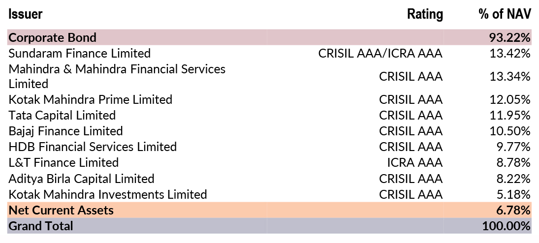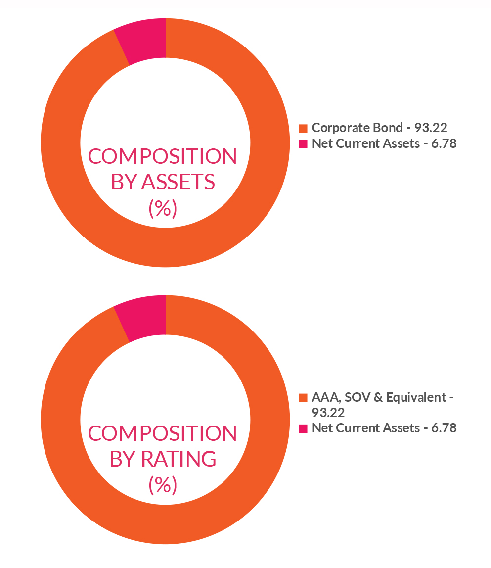 ![]() | RESIDUAL MATURITY* | 1.51 years | MODIFIED DURATION* | 1.33 years | MACAULAY DURATION* | 1.43 years | Annualised Portfolio YTM * | 6.97% |