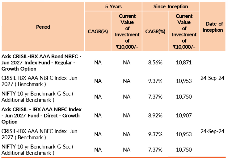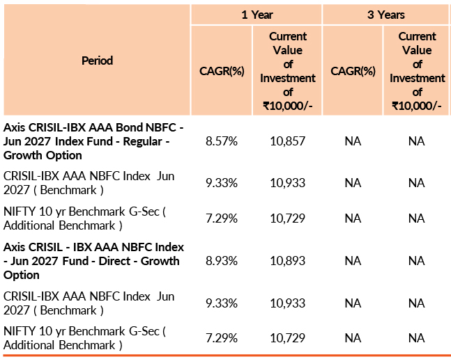 | AXIS CRISIL IBX AAA BOND NBFC JUN 2027 INDEX FUND | 30-Sep-2025 | -0.76 | - | - | - | -0.81 |