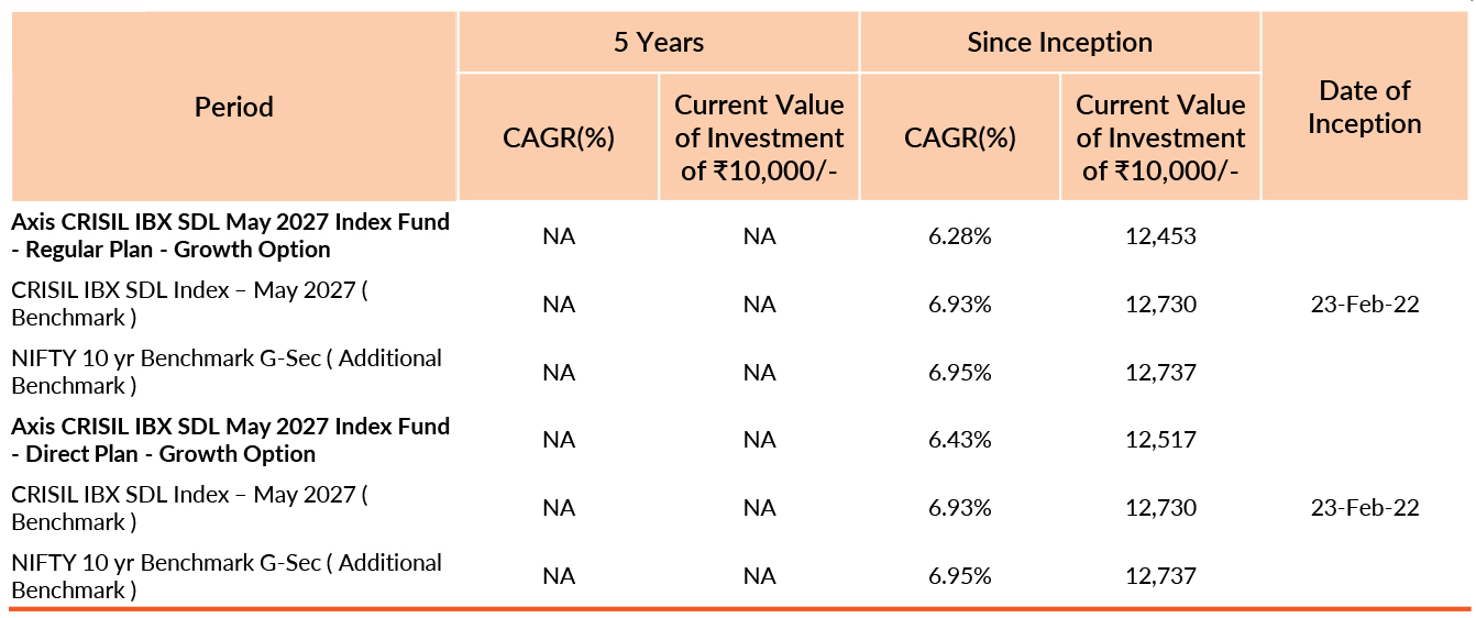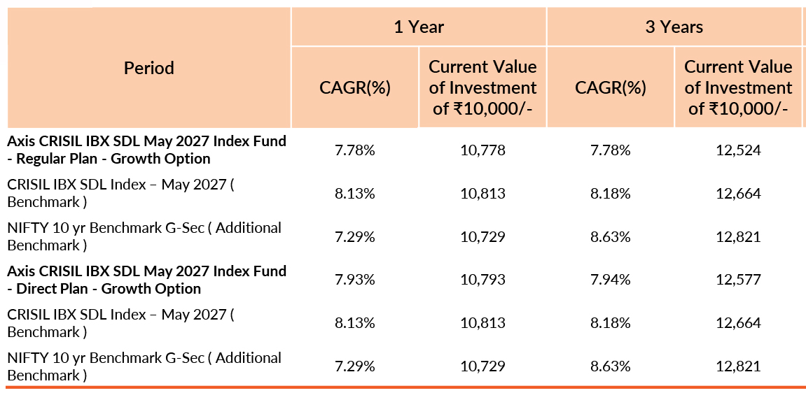 | Axis CRISIL IBX SDL May 2027 Index Fund | 30-Sep-2025 | -0.34 | -0.4 | - | - | -0.65 |
