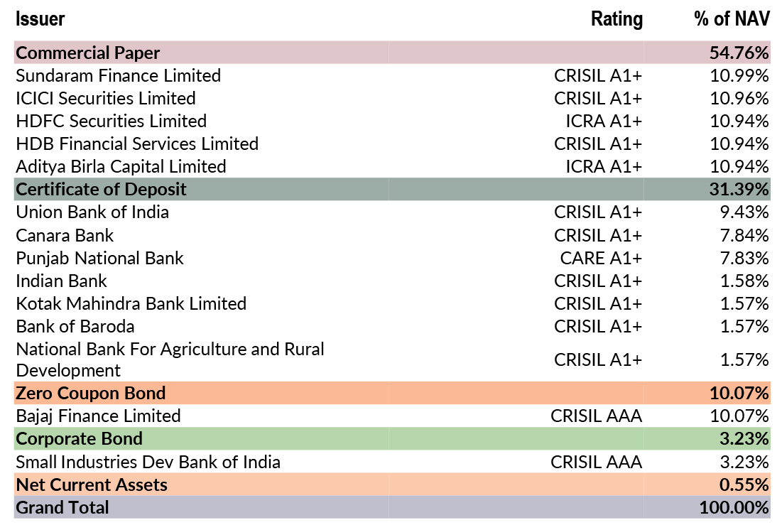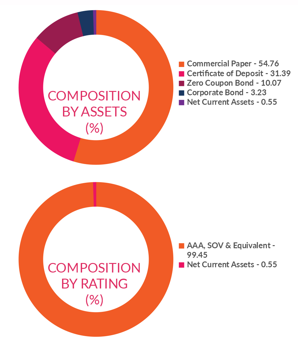 ![]() | RESIDUAL MATURITY* | 0.42 years | MODIFIED DURATION* | 0.4 years | MACAULAY DURATION* | 0.42 years | Annualised Portfolio YTM * | 6.46% |