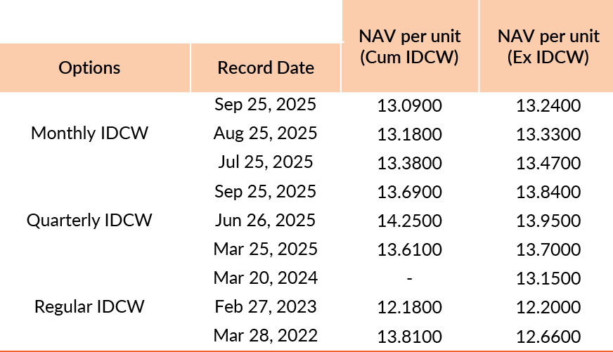 Pursuant to payment of Distribution (of Income & Capital), the NAV of the above stated IDCW options of the scheme/plan would fall to the extent of payout and statutory levy, if any. Past performance may or may not be sustained in future. Face value of units is ₹ 10. IDCW means Income Distribution cum Capital Withdrawal.