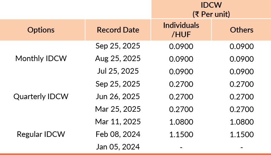 Pursuant to payment of Distribution (of Income & Capital), the NAV of the above stated IDCW options of the scheme/plan would fall to the extent of payout and statutory levy, if any. Past performance may or may not be sustained in future. Face value of units is ₹ 10. IDCW means Income Distribution cum Capital Withdrawal.