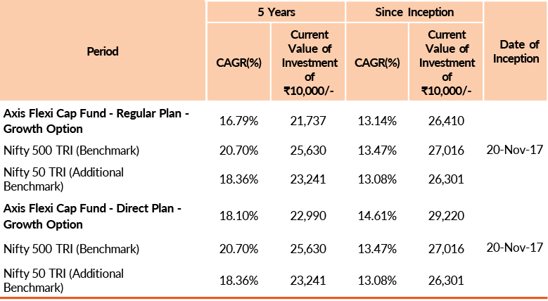 Past performance may or may not be sustained in future.Different plans have different expense structure. Sachin Relekar is managing the scheme since 1st February 2024 and he manages 4 schemes of Axis Mutual Fund & Krishnaa N is managing the scheme since 1st March 2024 and she manages 24 schemes of Axis Mutual Fund .Please refer to annexure for performance of all schemes managed by the fund manager. Returns greater than 1 year period are compounded annualised (CAGR). Face Value per unit : ₹ 10.