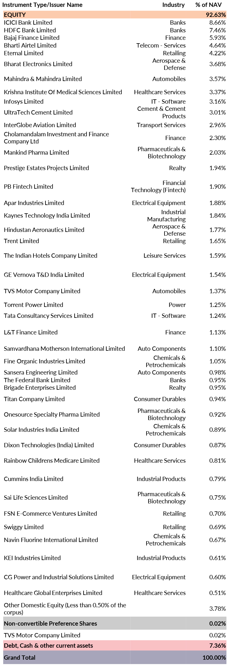 ^^Market caps are defined as per SEBI regulations as below: a. Large Cap: 1st -100th company in terms of full market capitalization. b. Mid Cap: 101st -250th company in terms of full market capitalization. c. Small Cap: 251st company onwards in terms of full market capitalization.