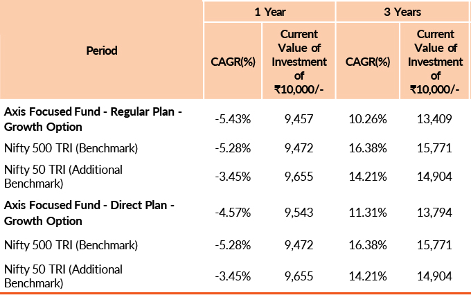 Past performance may or may not be sustained in future.Different plans have different expense structure. Sachin Relekar is managing the scheme since 1st February 2024 and he manages 4 schemes of Axis Mutual Fund & Krishnaa N is managing the scheme since 1st March 2024 and she manages 24 schemes of Axis Mutual Fund . Please refer to annexure for performance of all schemes managed by the fund manager. Returns greater than 1 year period are compounded annualised (CAGR). Face Value per unit : ₹ 10.