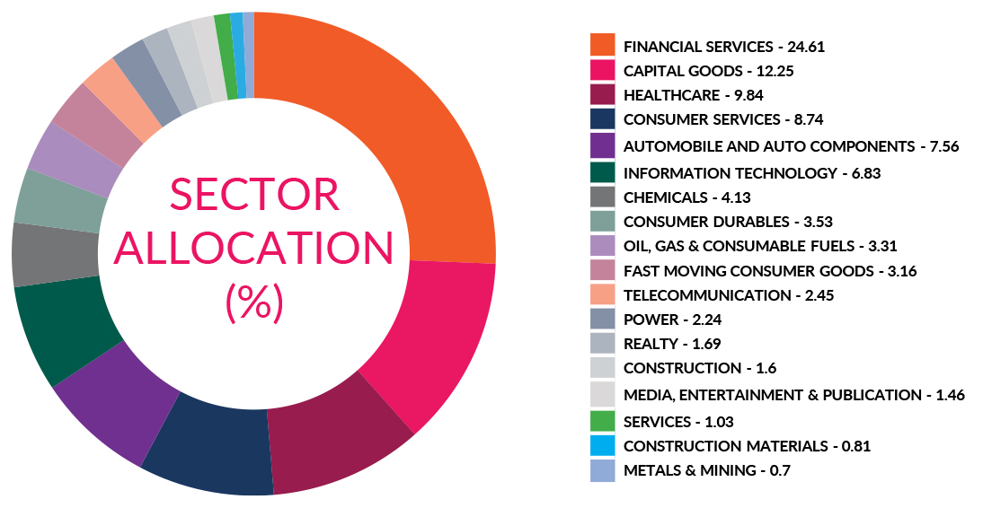 ^^Market caps are defined as per SEBI regulations as below: a. Large Cap: 1st -100th company in terms of full market capitalization. b. Mid Cap: 101st -250th company in terms of full market capitalization. c. Small Cap: 251st company onwards in terms of full market capitalization.
