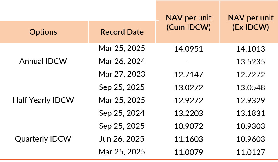 Pursuant to payment of Distribution (of Income & Capital), the NAV of the above stated IDCW options of the scheme/plan would fall to the extent of payout and statutory levy, if any. Past performance may or may not be sustained in future. Face value of units is ₹ 10. IDCW means Income Distribution cum Capital Withdrawal.