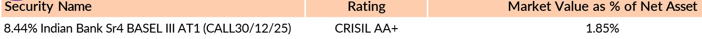 *in case of semi annual YTM, it will be annualised *As per AMFI Best Practices Guidelines Circular No. 88 / 2020 -21-Additional Disclosures in Monthly Factsheets. @ Based on debt portfolio only. For instruments with put/call option, the put/call date has been taken as the maturity date. This should not be taken as an indication of the returns that maybe generated by the fund and the securities bought by the fund may or may not be held till their respective maturities. The calculation is based on the invested corpus of the debt portfolio. | ||