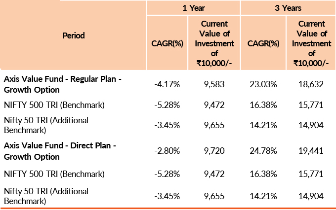 Past performance may or may not be sustained in future.Different plans have different expense structure. Nitin Arora is managing the scheme since 26th May 2023 and he manages 4 schemes of Axis Mutual Fund & Krishnaa N is managing the scheme since 1st March 2024 and she manages 24 schemes of Axis Mutual Fund . Please refer to annexure for performance of all schemes managed by the fund manager. Returns greater than 1 year period are compounded annualised (CAGR). Face Value per unit : ₹ 10.