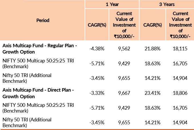 Past performance may or may not be sustained in future.Different plans have different expense structure. Nitin Arora is managing the scheme since 26th May 2023 and he manages 4 schemes of Axis Mutual Fund & Shreyash Devalkar is managing the scheme since 1st March 2023 and he manages 8 schemes of Axis Mutual Fund & Hitesh Das is managing the scheme since 26th May 2023 and he manages 4 schemes of Axis Mutual Fund . Please refer to annexure for performance of all schemes managed by the fund manager. Returns greater than 1 year period are compounded annualised (CAGR). Face Value per unit : ₹ 10.