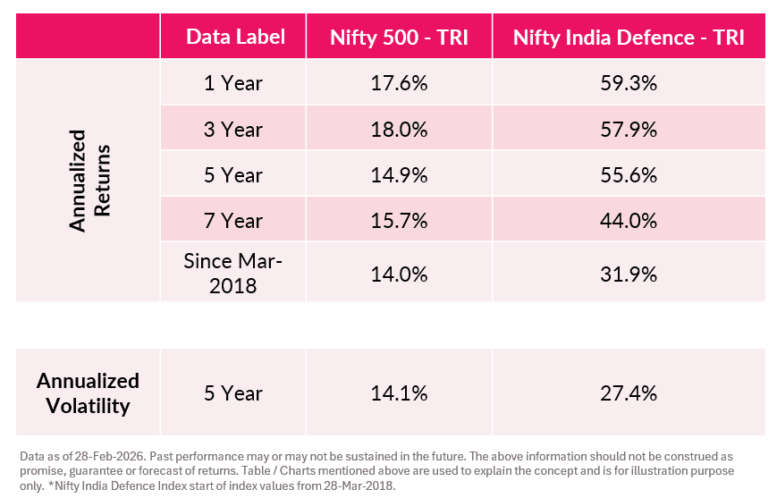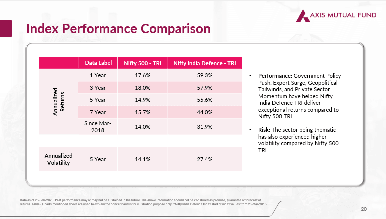 Source: Axis Mutual Fund Research.While past performance is not indicative of future results, the Nifty India Defence TRI has outperformed the broader index over several time horizons. This hasn’t been without volatility. The 5-year annualized volatility of 27.4% also indicates a sharper drawdown during corrections.