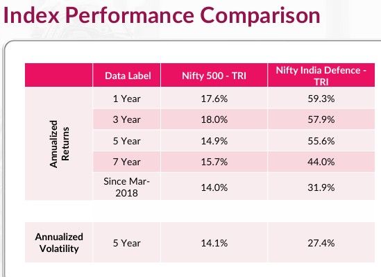 Most defence companies operate in segments where competition is genuinely thin. Getting into this industry takes years of regulatory approvals, specialised technology, and government trust that doesn't transfer overnight. That gives established players predictable order books and pricing power that may not exist in most sectors.At the same time, valuations remain sensitive to:- Changes in government policy - Delays in large projects - Shifts in geopolitical conditions Apart from this, the five-year annualised volatility of the defence index is 27.4%, compared to 14.1% for the Nifty 500 TRI, so the higher returns have not come without the higher risk. (Source: https://www.niftyindices.com/ Data as of 28-Feb-2026.Past performance may or may not be sustained in the future. The above information should not be construed as promise, guarantee or forecast of returns. Table / Charts mentioned above are used to explain the concept and is for illustration purpose only.Nifty India Defence Index start of index values from 28-Mar-2018.)